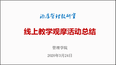 为加强教师间学习交流,进一步提升网络教学质量,3月24日,酒店管理教研室开展了线上教学观摩活动,教研室全体教师共同观摩了胡梦姚老师主讲的《旅游接待业》课程中“旅行社接待业务管理”章节。