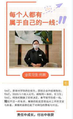 实习生党员何颜,春节期间放弃与家人团聚的机会,选择坚守岗位,帮助业主拿快递、送外卖、送水送菜,执行无接触派送的任务,一天下来要走10多公里,她虽疲惫,从不抱怨,说的最多的一句话:我加油!