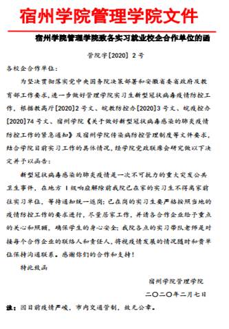 疫情发生后,学院党政领导十分担心第二批121名实习学生的安全。经学院党政联席会研究下发文件并致函校企合作单位,提出学院已在家的实习生不得离家前往实习单位,等待通知统一返岗;已在岗的实习生要严格按照当地的疫情防控工作的要求进行,尽量居家工作,并请各合作企业给予重点的关心和照顾,确保学生的身心安全;学院各点的实习带队老师是对接每个合作企业的联络人和责任人,将视疫情发展的情况随时企业保持沟通联系。