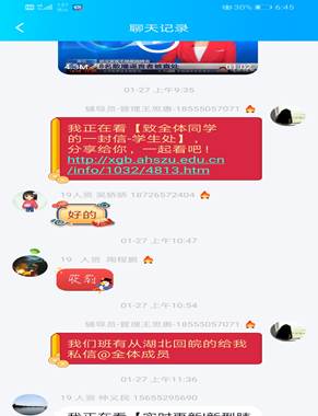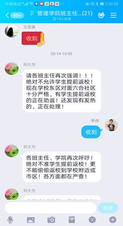 学院上下齐心协力,共同阻击疫情。学院党政办主任、辅导员等严格执行疫情“日报”制度,每天上报师生的身体健康情况、外出回校等动态信息,及时向学校相关部门进行汇报。全体师生积极响应支持,主动报告个人情况。辅导员认真督促学生每天登陆“今日校园”APP,填写“疫情每日一报”,掌握每位同学的寒假去向和即时状态,及时传达延迟开学、杜绝提前返校、线上教学等通知要求。并及时关心关爱学生的心理健康,做好疫情危机干预,提供正面官方消息,缓解学生的恐惧和惊慌情绪,做好心理疏导工作。实训中心、团总支、就业工作专员等积极做好疫情期间学生实习管理、志愿者和就业服务工作。