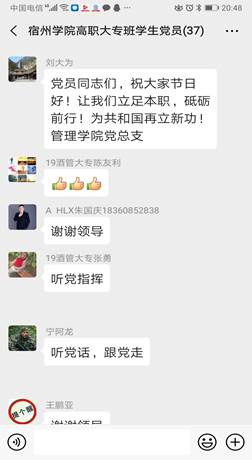 学院加强防疫抗疫政策宣传和学习,统一思想。学院通过学院工作群、教师党员群、高职大专班学生党员群、辅导员工作群、班级群、信息员群以及短信电话等方式,及时传达学习习近平总书记关于新型冠状病毒感染的肺炎疫情防控工作重要指示精神、学校疫情防控工作部署和要求,宣传新型冠状病毒防控科普知识,做到无遗漏,全覆盖。全院师生热情高涨,信心百倍,坚决落实各项防控措施,用实际行动支持党中央决策部署。