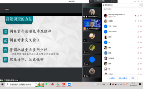 2022年6月11日晚上19:00-19:55,《社会调查研究》课程邀请上海捷毅人力资源公司资深顾问石磊经理为人力资源管理专业学生进行线上讲授《公司与人选的背景调查》。武永成、孙裕金、罗牧晨三位老师参与本次课程共建,与课程主讲嘉宾共同拟定课程的主题、授课方式、基本的框架。鉴于疫情防控影响,本次活动一再变动和推迟,演讲嘉宾克服上海疫情的影响,采取线上腾讯会议的方式授课。