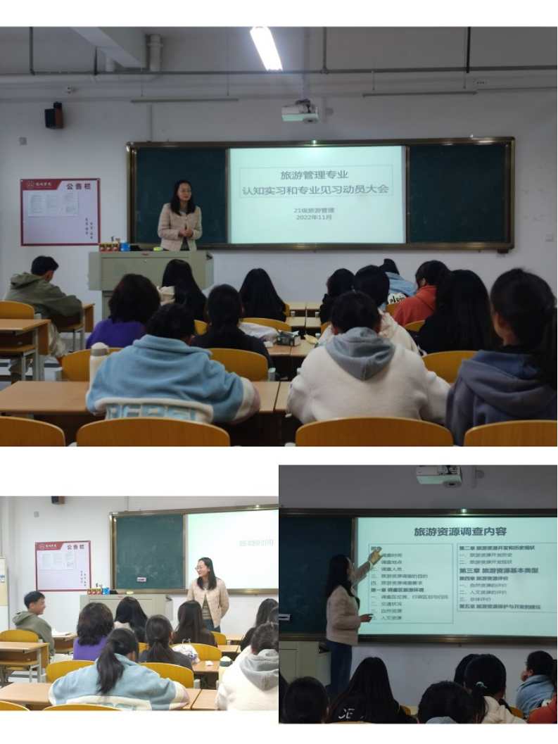 为确保活动顺利进行,2022年11月21日分别召开了两个年级的实践周动员会和集中实践教学活动布置会,旅游管理教研室李龙、苗慧慧和傅青钰老师进行了工作布置。三位老师分别就实践周的活动内容和活动安排作出了详细的说明,阐述了本次活动宗旨,详细说明了活动时间和活动地点以及具体的流程,并重点强调了此次活动的重要性和意义,要求学生在活动中全力以赴,争取交出比较理想的作品。