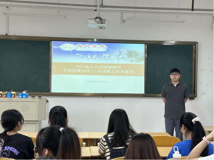 依据《人力资源管理专业本科人才培养方案》(2019版)的规定,2021级人力资源管理班本学期需要开设专业拓展训练(1)课程。为做好本次集中实践活动,工商管理教研室组织专题研究,成立了专业集中实践活动领导小组,制定了实施方案,并于2023年6月12日通过线下方式对2021级人力资源管理班全体学生进行了工作布置。