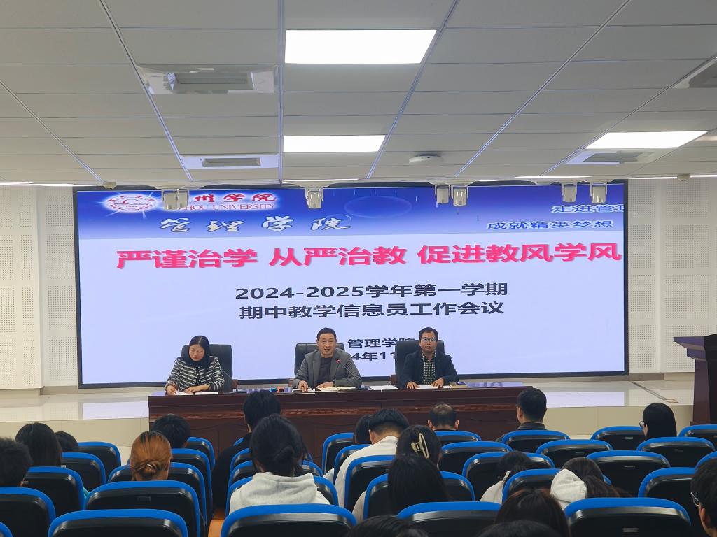 为加强期中教学管理,不断提高学院教育教学和管理工作的质量,及时了解教师和学生教与学的情况,学生自我管理和行政管理等相关工作中的成效以及需要加强改进的问题,充分发挥学生参与教育教学管理的主动性和积极性,按照校、院相关文件精神及工作计划安排,管理学院于2024年11月1日13点在实习实训楼C103召开2024-2025学年第一学期期中教学信息员工作会议。2022、2023、2024级各班级信息员参会,会议主题为“严谨治学,从严治教,促进教风学风”。院长韩传龙、党委副书记张增林、教学副院长宋徽、各教研室主任及相关工作负责人参会,院长韩传龙主持会议。