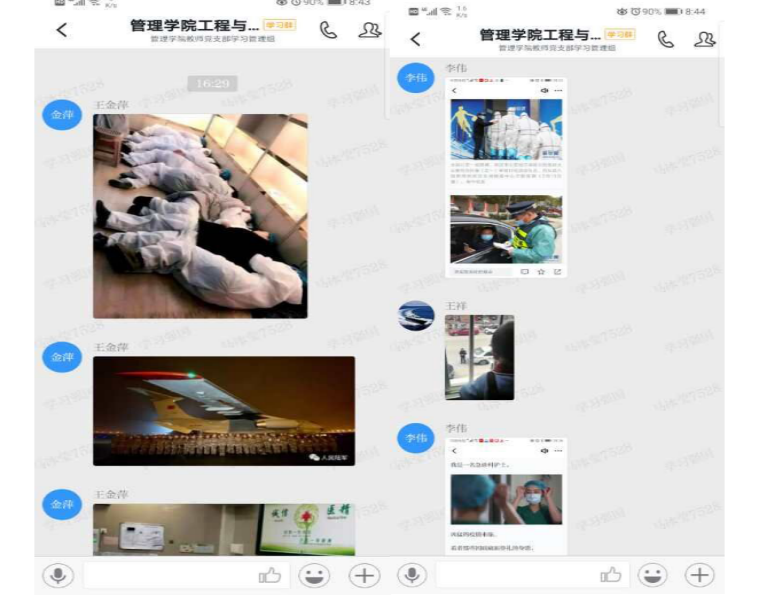 党员们纷纷在群里分享了抗疫防控工作中令人感动的照片,分享了优秀党员在防疫工作中的贡献。党员教师邓福康、王祥、黄丽艳、陈小芳、李伟、王思惠、王金萍等老师结合分享的图片谈了个人的感受。