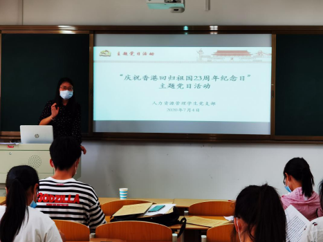 在香港特别行政区成立二十周年之际,习近平总书记参观了“香港回归祖国二十周年成就展”并作出重要指示。为庆祝香港回归祖国23周年,7月4日下午3:30,人力资源管理学生党支部在实训楼c113召开七月份主题党日活动。支部书记王思惠主持,全体党员参加。