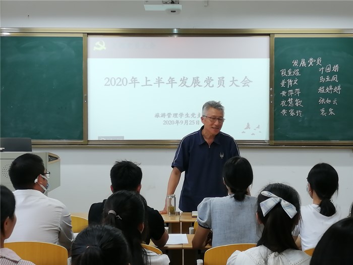 2020年9月25日下午3:00,旅游管理学生党支部于实训楼C104召开2020年上半年发展党员大会。会议由旅游管理学生党支部书记陈鹏主持,党总支副书记王永宁、部分教师及支部全体党员参加。
