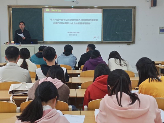 为加强学生党员素养,深入培养学生党员爱国爱党意识。11月6日下午1:30,学院工程管理学生党支部开展《学习习近平总书记在纪念中国人民志愿军抗美援朝出国作战70周年大会上的重要讲话精神》集中学习会。会议由支部书记徐敬亮主持,支部全体成员参加。