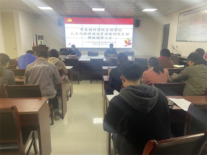 根据《关于认真做好基层党支部换届选举工作的通知》精神,经学院党委同意,2021年11月11日下午13:00,人力与旅游酒店管理教师党支部在实习实训楼C301会议室举行换届选举大会,本次会议由旅游管理教研室主任李龙主持。管理学院院长韩传龙、副院长宋徽以及人力与旅游酒店管理党支部党员教师参与会议,会议应到会正式党员18名,实际到会17名,到会有选举权的党员超过应到会人数的五分之四,符合规定人数。