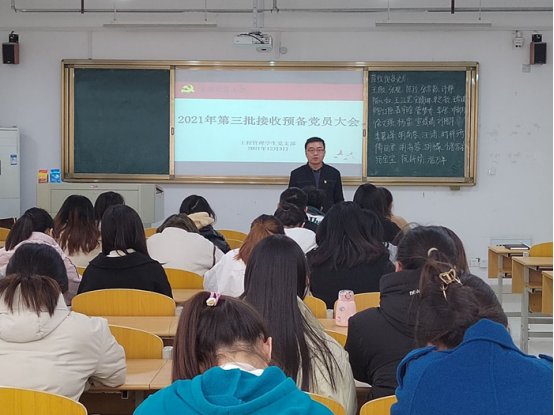 工程管理学生党支部于12月3日中午12:30在实训楼C105召开2021年第三批接收预备党员大会。本次会议由支部书记徐蒙主持,党委书记蔡若愚出席指导,支部委员和全体学生党员参加。