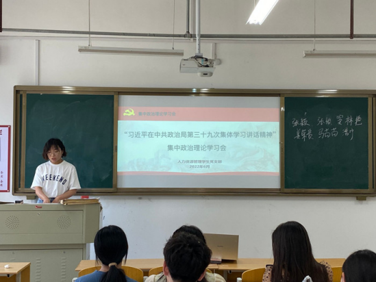 6月21日中午12:30,学院人力资源管理学生党支部于实训楼C111召开习近平在中共中央政治局第三十九次集体学习讲话精神和《中国共产党普通高等学校基层组织工作条例》集中政治理论学习会。本次会议支部全体学生党员参加,由支部书记巩艳艳主持。