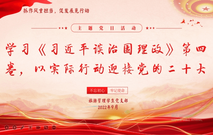 9月29日上午8:30,管理学院旅游管理学生党支部依托“QQ党群”平台于线上召开了“学习《习近平谈治国理政》第四卷、以实际行动迎接党的二十大”主题党日活动。本次主题党日活动支部全体学生党员参加,会议由支部书记杨利元主持。