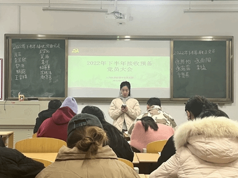 会议严格按照接收预备党员的程序进行。首先由巩艳艳发表讲话,并向与会同志们宣读了本次会议主题、会议流程以及本次会议接收预备党员的人员名单,随后,周芸等11位入党积极分子依次上台发言,她们从思想、学习、生活、工作四个方面汇报了自己近期的个人情况,并表示会在今后的学习工作中,坚定目标、更加严格要求自己,努力改正现有的不足。接着,由入党介绍人王思惠、林啸啸等同志发表讲话,充分肯定了周芸等11位同志在考察期内的优秀表现,政治立场的坚定,党性觉悟的提高,并认为周芸等11位同志已具备成为预备党员资格。随后,经与会党员的讨论和正式党员的无记名投票表决,一致同意接收周芸等11位同志为预备党员。会议最后,巩艳艳进行总结,她在对这11名预备党员给予肯定和表示祝贺的同时,还强调各位学生党员在以后的学习生活中能够不忘初心,牢记党史,砥砺前行。