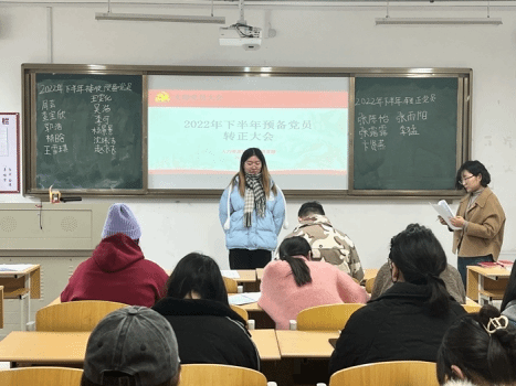 会议严格按照组织程序进行,首先由巩艳艳发表讲话,向与会同志们宣读了本次会议主题以及会议流程,随后张陈怡等5位同学作为预备党员依次上台汇报,向党组织汇报自身对党的认识、入党动机、个人经历以及在校表现等,客观分析自身优缺点并说明今后努力的方向。接着,预备党员的入党介绍人蔡若愚、林啸啸等教师根据5位预备党员的近期表现给予评价,肯定了各位同志在学习和工作上取得的优秀成绩,同时也指出相关不足之处,鼓励他们继续提升自身思想道德素养,并采取无记名投票的方式进行表决,一致同意接收张陈怡等5名同志为正式党员。最后,巩艳艳对5名正式党员表示热烈祝贺,同时希望全体学生党员能坚守共产党人的初心和使命,不断坚定理想信念、练就过硬本领、站稳人民立场、投身强国伟业,做一名有理想有本领有担当的新时代合格青年。