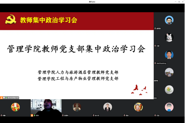 2022年12月30日下午,管理学院人力与旅游酒店管理教师党支部和工程与房产物业管理教师党支部通过腾讯会议组织开展集中政治学习活动。教师支部书记及全体教师党员参加。