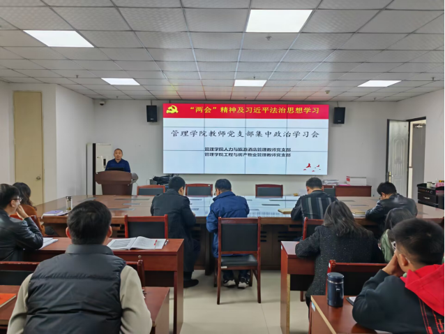 为深入学习贯彻两会精神和习近平法治思想,管理学院人力与旅游酒店管理教师党支部和工程与房产物业管理教师党支部于2023年3月8日下午在实习实训楼C301组织专题集中政治学习活动。教师支部书记及全体教师参加。