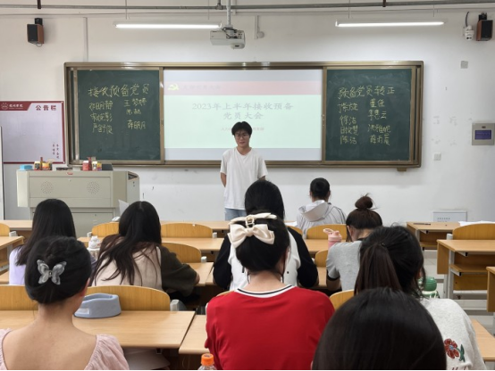 会议严格按照接收预备党员的程序进行。首先由巩艳艳发表讲话,并向与会同志们宣读了本次会议主题、会议流程以及本次会议接收预备党员的人员名单,随后,薛明月等6位入党积极分子依次上台发言,她们从思想、学习、生活、工作四个方面汇报了自己近期的个人情况,并表示会在今后的学习工作中,坚定目标、更加严格要求自己,努力改正现有的不足。接着,由入党介绍人王思惠、周雯等同志发表讲话,充分肯定了薛明月等6位同志在考察期内的优秀表现,政治立场的坚定,党性觉悟的提高,并认为薛明月等6位同志已具备成为预备党员资格。随后,经与会党员的讨论和正式党员的无记名投票表决,一致同意接收薛明月等6位同志为预备党员。会议最后,巩艳艳进行总结,她在对这6名预备党员给予肯定和表示祝贺的同时,还强调各位学生党员在以后的学习生活中能够不忘初心,牢记党史,砥砺前行。