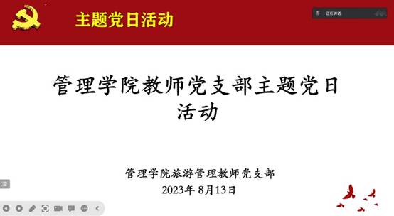 为深入贯彻主题教育、开展“三问”讨论的相关要求,2023年8月13日,管理学院旅游管理教师党支部开展“三问”主题党日活动,学院党委委员、旅游管理教师党支部书记李龙主持。