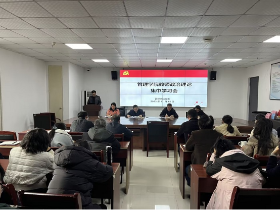 2023年11月15日下午,管理学院在实习实训楼C301会议室召开教师政治理论集中学习会,学院党委书记蔡若愚,党委副书记、院长韩传龙,党委副书记、纪委书记张增林,副院长宋徽以及全体教师参加会议,会议由蔡若愚主持。