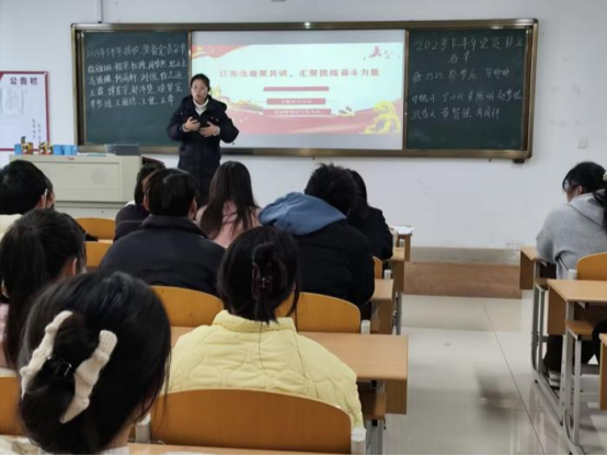 王思惠首先带领大家学习宪法法律知识,提高宪法法律意识。并指出要以习近平总书记重要指示为根本遵循,学习贯彻习近平法治思想,全面贯彻落实党的二十大精神,强化宪法意识,弘扬宪法精神,推动宪法实施,更好发挥宪法在全面建设社会主义现代化国家、以中国式现代化全面推进中华民族伟大复兴中的重要作用。随后,王思惠强调:“以法为纲,循法而治。”制定和实施宪法,是人类社会走向现代化的重要支撑。党的二十大擘画了全面建设社会主义现代化国家、以中国式现代化全面推进中华民族伟大复兴的宏伟蓝图,对坚持依宪治国、依宪执政提出了新的更高要求。新征程上,要坚定维护宪法权威和尊严,推动宪法完善和发展,更好发挥宪法在治国理政中的重要作用,为以中国式现代化全面推进强国建设、民族复兴伟业提供坚实保障。要贯彻习近平法治思想,坚持宪法规定、宪法原则、宪法精神全面贯彻。最后,学生党员表示:要认真贯彻落实习近平总书记的重要指示,在日常工作中坚持不懈做好宪法法律宣传教育工作,鼓励身边的人学习宪法法律知识,提高宪法法律意识。