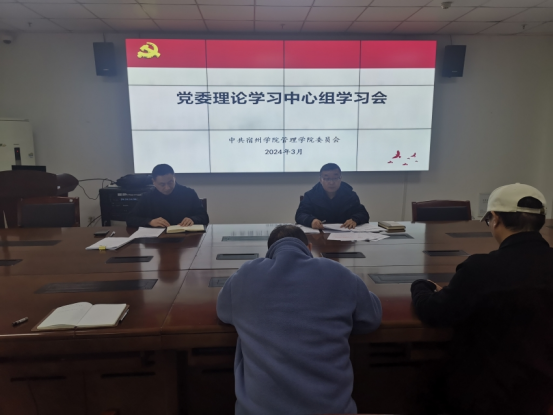 蔡若愚领学了习近平总书记在中共中央政治局第十一次集体学习时的重要讲话精神和参加江苏代表团审议时的重要讲话精神;院党委副书记、院长韩传龙领学了《2024年国务院政府工作报告》;与会理论学习中心组成员集体学习了《宿州学院管理学院党委会会议议事规则》和《宿州学院管理学院党政联席会议议事规则》。