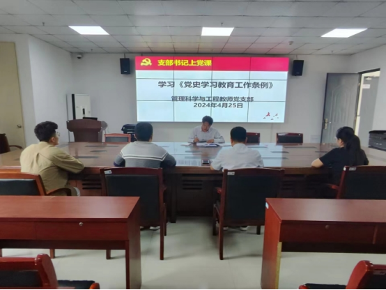 2024年4月25日下午,管理科学与工程教师党支部在实习实训楼C301会议室开展了支部书记讲党课活动。本次活动由支部书记罗成立主讲,围绕《党史学习教育工作条例》,管理学院全体教师党员进行了深入学习。