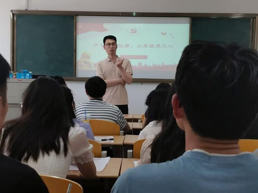 6月25日下午,管理学院工程管理学生党支部在实训楼C210召开“严守党的纪律,永葆敬畏之心”的党课。本次会议支部全体学生党员参加,由支部书记芮飞主持。