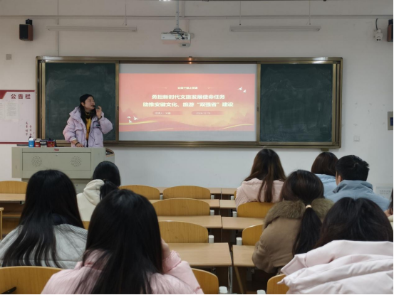 为深入学习贯彻习近平文化思想和习近平总书记关于旅游发展的重要论述,明确新时代文旅工作者的使命与责任,旅游管理学生党支部于2024年12月16日于实训楼C213开展了“勇担新时代文旅发展使命任务,助推安徽文化、旅游‘双强省’建设”主题党课,本次党课由管理学院副院长宋徽主讲,支部全体学生党员参加。