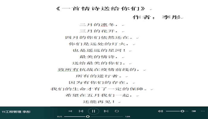 本次比赛采取线上形式举办,以“致敬抗疫英烈,传承英烈精神”为主题,参赛者可以通过录制音频、视频等方式参与比赛。比赛之中,同学们充分发挥自己的主观创作精神,一个个小小的视频、音频里,慷慨激昂的情感借以铿锵有力的声音,歌颂出抗疫一线那些感人至深的瞬间,歌颂出对抗疫英烈最崇高的敬意与最真挚的感谢,歌颂出对于抗疫英烈们最深切的悼念。最终,在评委们的公正评定之下,19工程管理李彤获得一等奖,19人力资源管理查宝欣与18酒店管理左吴清获得二等奖,19工程管理吴明珠、19房地产开发与管理蔡祥雯和19工程管理宋伟丽获得三等奖。