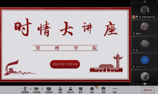 本次线上时情大讲堂讲座内容丰富、观点鲜明、语言生动,达到了开阔视野、精神振奋的良好效果。教育引导学生深入学习贯彻习近平新时代中国特色社会主义思想,坚定理想信念,牢记初心使命,积极应对各类风险挑战,团结战胜各种艰难险阻,坚持不懈朝着实现中华民族伟大复兴的目标砥砺奋进。