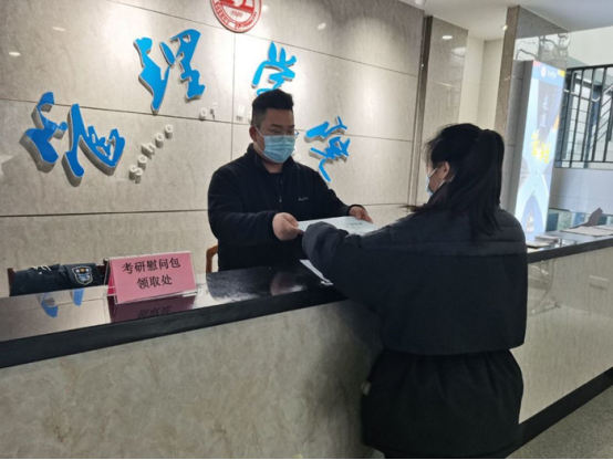为提升考研学生的信心,鼓励考研学生积极备考、坚定信心,缓解考研学生压力,帮助解决考研学生在备考阶段所遇到的问题,12月15日-12月16日,管理学院组织开展了“寒冬送温暖,情系考研生”考研慰问活动,在管理学院一楼大厅安排学生工作助理总队学生值班并发放管理学院为考研学子特殊定制的考研慰问包。
