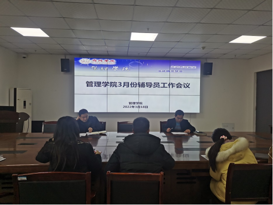 3月18日下午,管理学院在实训楼C301会议室召开3月份辅导员工作会议,学院党委书记蔡若愚、院长韩传龙及各班辅导员参加会议,会议由学院党委副书记张增林主持。