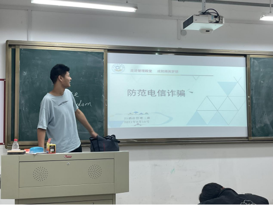 为进一步提高学生反诈能力,做到全面强化预警防范,全力构筑“全民反诈”防线,班级于2022年9月15日上午在管理学院c107举行了“防范电信诈骗”主题班会。班会由辅导员徐蒙老师主持,心理委员黄乐乐和宣传委员沈星雨组织,21酒店管理三班的同学们全体参加。