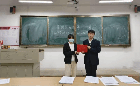 本次比赛以线下笔试的形式进行,参赛选手积极准备,试题围绕“弘扬中国传统文化,发扬中国传统文化魅力”设置了包含传统文化知识单选、诗词填空、成语翻译等多种类型的试题,围绕中国诗词、传统服饰、传统节日等从不同角度、不同方面、不同层次考察了同学们们对传统文化的了解程度。竞赛场上氛围紧张,同学们沉着冷静,认真答题,经过一个小时的激烈比拼,参赛选手提交答卷,相关负责人当场批改并评选出了此次活动的获奖人员。活动最后,由相关负责人为获奖同学颁发证书及奖品并拍照留念,活动现场参赛同学纷纷表示,在本次答题过程中切实感受到了中华传统文化的历史悠久,对于中华文化有一个更深入的认识,接下来将承担起作为一名新时代青年弘扬中华优秀传统文化的使命。