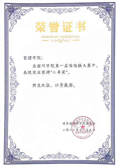 为丰富校园文化生活,推进体育教学,增强广大学子的体育锻炼意识,培养体育精神,增强学生集体荣誉感、团队协作意识和竞争意识,展现学子朝气蓬勃的精神风貌,营造健康向上的校园文化氛围,管理学院积极准备啦啦操比赛,并在宿州学院第一届啦啦操比赛中喜得佳绩。
