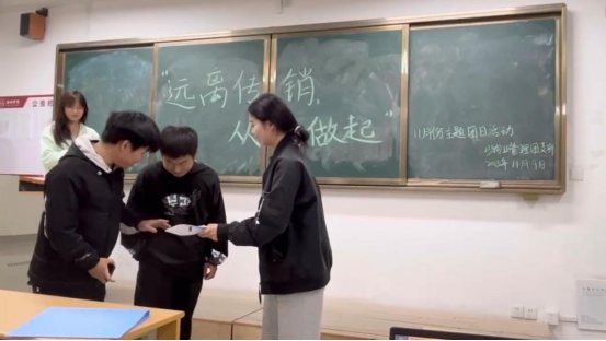 本次活动同学们集体学习防传销知识,在活动开始前每小组选出一个代表共同宣讲《中华人民共和国禁止传销条例》,同学们踊跃参与,对提升防传销的意识和自我保护意识的积极性很高。并且这次活动小短剧的形式展开,同学们通过表演和观看小短剧能更好的了解传销的方式和危害,学会如何识别、防范、抵制传销,进而更好的提升同学们防传销的意识和自我保护意识。