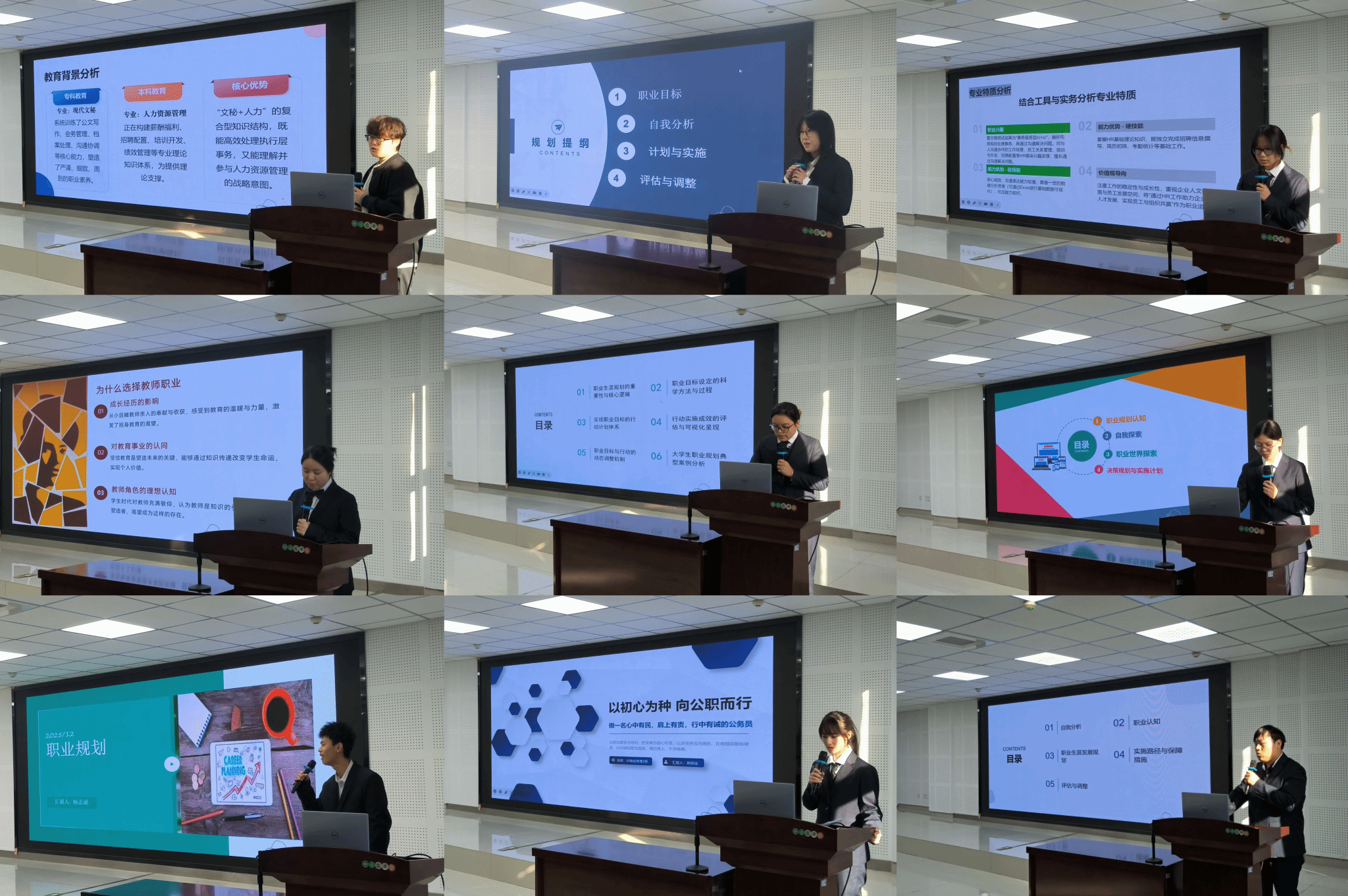 致辞结束后,比赛正式拉开帷幕。28 组选手按照抽签顺序依次登台,通过 PPT 展示与主题陈述相结合的方式,从自我认知、职业定位、目标拆解、行动计划等维度,系统呈现了各自的职业生涯规划方案。选手们结合管理类专业特色与个人特长,将职业目标锚定在企业管理、人力资源、市场营销、公共服务等多个领域,既展现了对行业趋势的精准把握,也体现了将个人发展融入社会需求的责任担当。