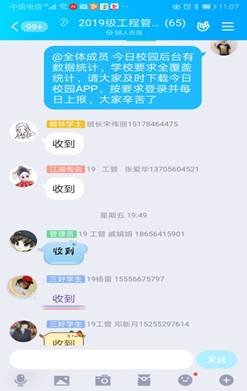 学院上下齐心协力,共同阻击疫情。学院党政办主任、辅导员等严格执行疫情“日报”制度,每天上报师生的身体健康情况、外出回校等动态信息,及时向学校相关部门进行汇报。全体师生积极响应支持,主动报告个人情况。辅导员认真督促学生每天登陆“今日校园”APP,填写“疫情每日一报”,掌握每位同学的寒假去向和即时状态,及时传达延迟开学、杜绝提前返校、线上教学等通知要求。并及时关心关爱学生的心理健康,做好疫情危机干预,提供正面官方消息,缓解学生的恐惧和惊慌情绪,做好心理疏导工作。实训中心、团总支、就业工作专员等积极做好疫情期间学生实习管理、志愿者和就业服务工作。