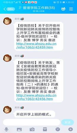 学院加强防疫抗疫政策宣传和学习,统一思想。学院通过学院工作群、教师党员群、高职大专班学生党员群、辅导员工作群、班级群、信息员群以及短信电话等方式,及时传达学习习近平总书记关于新型冠状病毒感染的肺炎疫情防控工作重要指示精神、学校疫情防控工作部署和要求,宣传新型冠状病毒防控科普知识,做到无遗漏,全覆盖。全院师生热情高涨,信心百倍,坚决落实各项防控措施,用实际行动支持党中央决策部署。