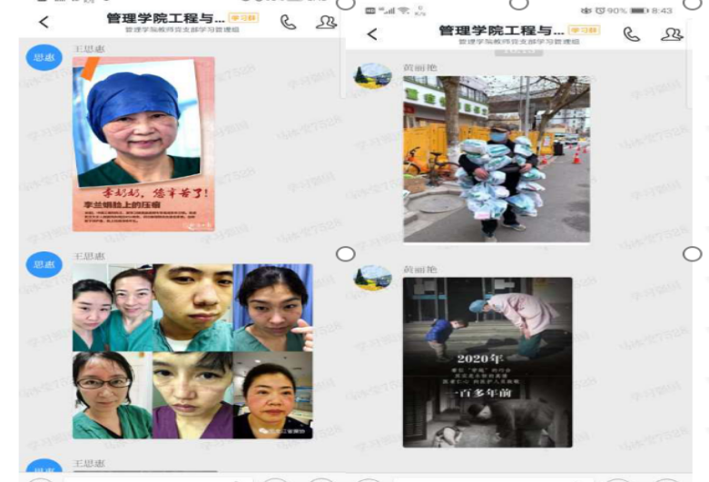 党员们纷纷在群里分享了抗疫防控工作中令人感动的照片,分享了优秀党员在防疫工作中的贡献。党员教师邓福康、王祥、黄丽艳、陈小芳、李伟、王思惠、王金萍等老师结合分享的图片谈了个人的感受。