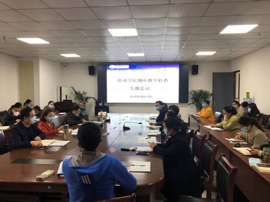 为认真落实疫情防控期间“停课不停学”要求,全面了解开学以来线上教学运行整体情况,及时发现和解决教学中存在的问题,加强教学过程的建设和管理,确保线上教学质量,促进优良教风、学风的形成,根据学校教学工作安排,确保本科教学检查工作任务顺利完成。管理学院于4月27日上午在实训楼C301召开期中教学检查专题会议,学院全体教师参加,会议由副院长韩传龙主持。
