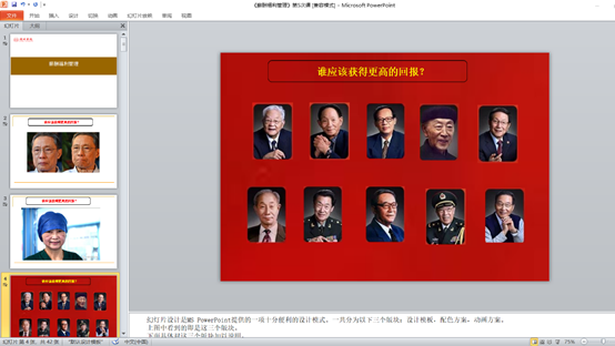 第六周,课程思政周。本周要求任课教师关注抗疫以来国家的相关政策和措施,以及抗疫形势,从中发掘爱国主义、集体主义、社会主义制度优势、生命教育、生态文明教育、健康教育、亲情教育、团结互助等思政素材,将其融入各类专业课程教学之中,融通思想政治教育与专业教育,推进全员全过程全方位育人。学院教师积极行动、精心准备,如《薪酬福利管理》课程,任课教师开篇时加了两个环节,一是放了钟南山、李兰娟和这么多年共31位最高科技奖获得者的图片,让大家看看能认识几人;二是让学生思考谁应该获得更高的回报,进而导入到课程知识点“薪酬水平决策”,较好的根据课程特点,实现了课程与思政无缝衔接、巧妙融合,既丰富了课堂内容,又活跃了课堂气氛、提高了育人质量。