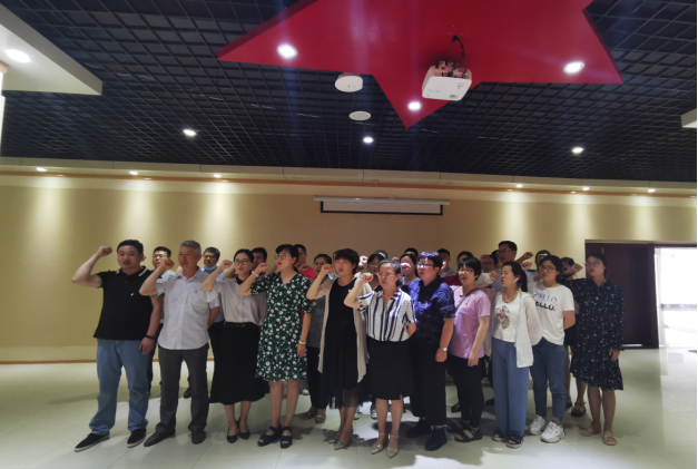 在党总支书记刘大为的带领下,全体教师党员面对党旗,举起右手,庄严宣誓。