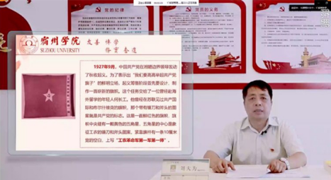 刘大为首先以历史事件为轴线讲述了党旗样式发展、党旗使用规范制定等内容,并详细介绍了中共中央办公厅党旗制作和使用的若干规定和党旗的使用范围。刘大为强调这是中国共产党亮出的第一面旗帜,更是标志着中国革命必将走向胜利的旗帜,一个党员就是一面旗帜,千百万个共产党员的先进形象,就是党的光辉形象。作为一名学生党员,更要有“向我看齐”的坚持,要干在实处,走在前列,做重责任、敢担当、讲奉献的党员。