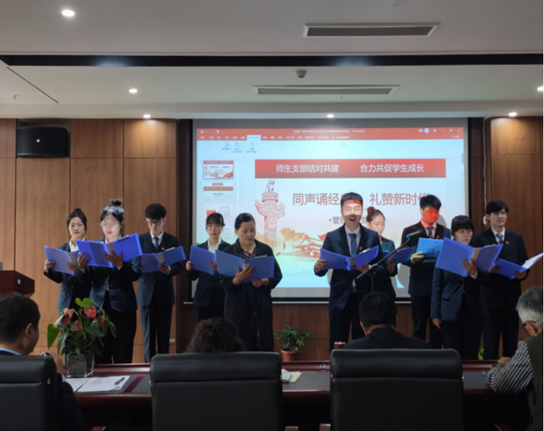 为更好增强师生支部的活力,更好发挥基层支部的战斗力,管理学院以“师生支部结对共建、合力共促学生成长”为目标,开展支部结对共建系列活动,,强化师生支部之间的交流,促进学生成长成才,同时,促进传承和弘扬中华优秀传统文化。10月29日中午12:00,为传承和弘扬中华优秀传统文化,学院在C502举办“同声诵经典·礼赞新时代”诵读比赛。参与本次经典诵读比赛的评委有:党总支书记刘大为、院长吴玲、党总支副书记王永宁、副院长韩传龙、党务秘书王淑霞。