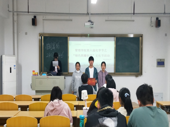 为贯彻落实在校大学生建设绿色环保型校园的理念,提高在校大学生的环保素质,促进学生综合发展,11月5日,管理学院于实训楼C211举办第六届化学文化节之“绿色照耀你我”活动。