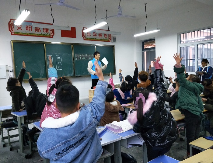 活动伊始,相关负责人通知志愿者们佩戴口罩在指定地点集合,统一服饰后乘坐公交车前往活动地点。在到达胡李小学后,为确保支教活动能够完整、有序开展,各志愿小组开始分配具体工作,随后在学校老师的带领下志愿者们进入相应的班级开展支教活动。活动期间,志愿者先依次向孩子们进行自我介绍并送上精心准备的小礼物。接着,他们拿出提前准备好的课件给孩子们上课,并鼓励孩子们积极回答问题。在看到对数学运算一筹莫展的小同学时,志愿者们耐心倾听,认真解答,使得教室里充满欢乐愉悦的氛围。在音乐课上,志愿者带领孩子们演唱爱国歌曲,孩子们稚嫩的歌声清脆动听,久久萦绕在每一位志愿者心中。最后,在悠扬的下课铃声中此次活动画上了圆满的句号。