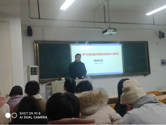 2020年12月28日上午,管理学院韩传龙教授在实习实训楼C楼210教室做了“基于学习型组织理念的现代管理”专题讲座。讲座由林啸啸老师主持,2018级人力资源管理专业全体学生参加了本次活动。