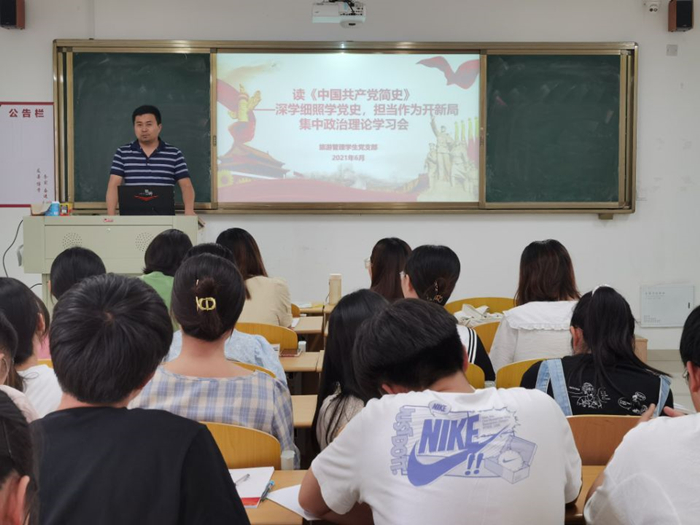 为了让学生党员更好的了解中国共产党的发展历史,6月16日中午,旅游管理学生党支部于实训楼C107开展贯彻落实“研读《中国共产党简史》——深学细照学党史,担当作为开新局”集中政治理论学习会。会议由支部书记陈鹏主持,全体学生党员参加。